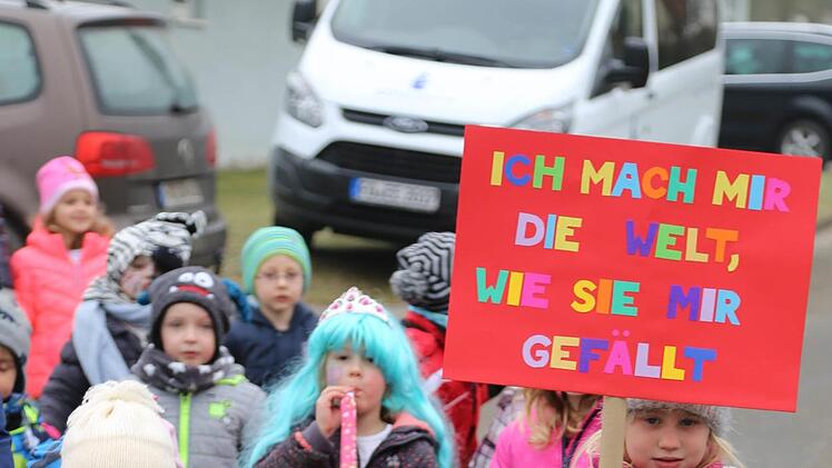 Wie Kindergartenleiterin Claudia Weigand erzählte, lautete das Motto "Helden". Dazu zählen die Kinder die Feuerwehr, Ritter, aber auch Märchenfiguren wie Prinzessinnen. An der benachbarten Grundschule schlossen sich nach einem kurzen Stopp zum ersten Mal auch die Schülerinnen und Schüler mit ihren Lehrkräften an, allen voran die neue Schulleiterin Barbara Groh-Eberle.