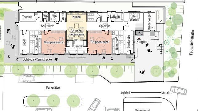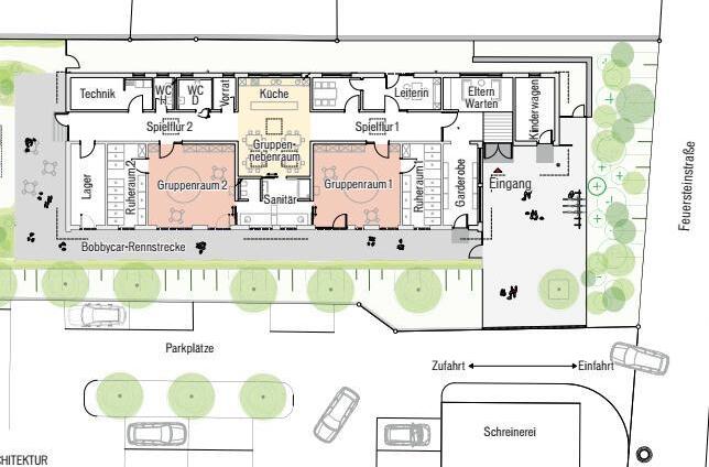 Die Konzeption sieht rechts neben dem Eingang den Kinderwagen-Abstellplatz vor und links daneben die Garderobe, von der ein Zugang zum Außenbereich möglich ist. "Damit die Kinder mit schmutzigen Schuhen nicht durch die Gruppenräume müssen", argumentierte der Planer.