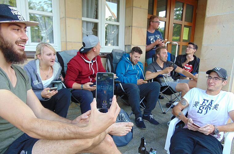 Oft 30 Jugendliche und junge Erwachsenen laufen nicht mit ihren Handys durch die Gegend, um die virtuellen Pokemon-Monster aufzuspüren. Gechillt sitzen sie auf mitgebrachten Klappstühlen vor dem Rathaus in Igensdorf und machen es sich mit Getränken auf den Stufen bequem - und schauen in ihr Handy, welches Pokemon sich gerade auf den Weg zum Rathaus macht.