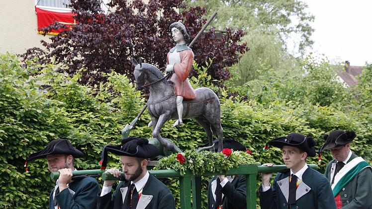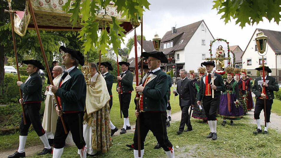 Angeführt von Pfarrer Albert Löhr und seinem Diakon Norbert Naturski unter dem Baldachin sowie dem Schutzpatron der Kirche, dem heiligen Georg, bewegte sich der lange Zug ab zehn Uhr durch die Dorfmitte, wozu die Feuerwehr die Straßen weiträumig abgesperrt hatte.