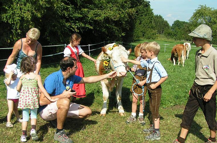 Schon von weitem begrüßte ihr Geläut die vielen Schaulustigen, die das ländliche Schauspiel angelockt hatte. Darunter zahlreiche Familien mit Kindern. Da durften die Kleinen schon mal die "Almi" die Leitkuh oder die "Fleckerln" streicheln und sich draufsetzen.