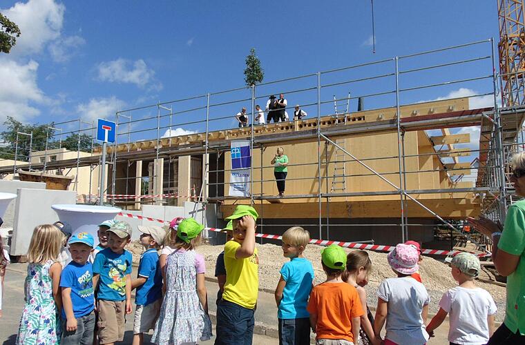 Carsten Hack, der Elternbeiratsvorsitzende erinnerte an die ungewisse Zeit aus Sicht der Eltern. Dass diese dem Kindergarten die Treue hielten, dafür dankte Fred Schäfer von der Diakonie. Doch Schäfer verhehlte nicht, dass es zu Anfangszeiten auch deutliche gegensätzliche Positionen gab. Das Miteinander habe gewonnen. Die Frage nach dem pädagogischen Konzept konnte geklärt werden und auch die Frage, ob der alte Kindergarten saniert wird oder neu gebaut wird, konnte, wie das Richtfest deutlich machte, geklärt werden.