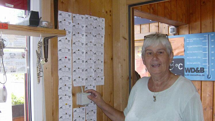 Zu ihren Aufgaben gehört auch der Kartenverkauf. Die Dauerkarten hat Rosi Heinisch an die Holzwand des Kiosks geheftet. Manche Badegäste kaufen nur eine Tageskarte.