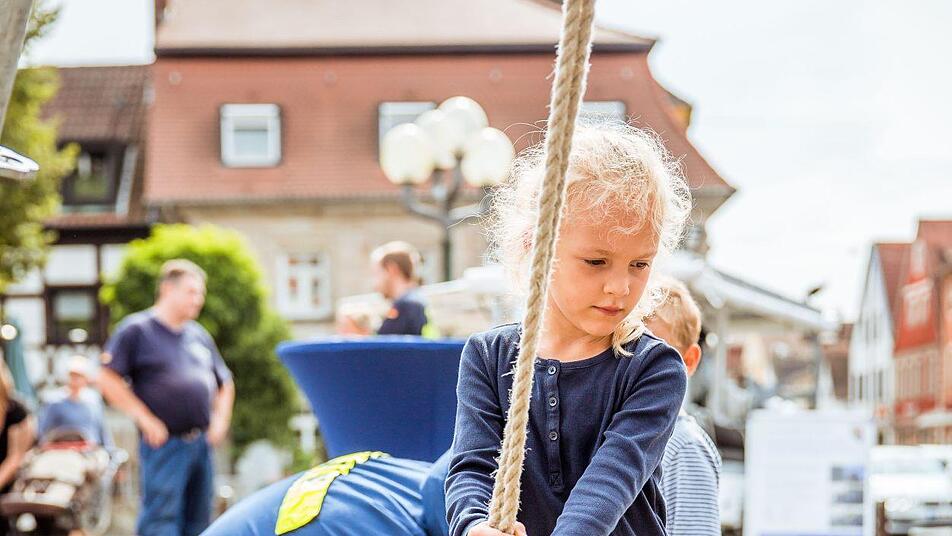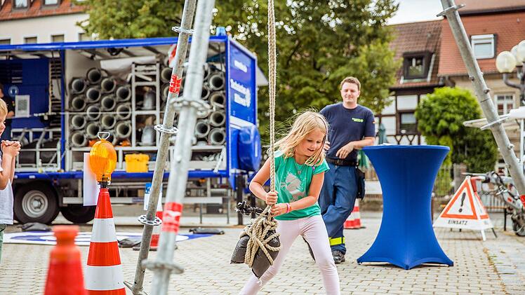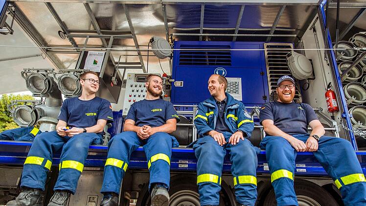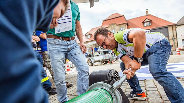Neben dieser Handarbeit wurde natürlich auch Technik vorgestellt: Beispielsweise die große Pumpe, die im Ernstfall 25 000 Liter Wasser pro Minute aus den überfluteten Gebieten pumpen kann und von der ein einziger Schlauch rund 80 Kilogramm wiegt. Gleich daneben stand die etwas kleinere Pumpe des Landkreises Forchheim, die zwar zur Löschwasserförderung gekauft wurde, aber im Ernstfall auch Hochwasser wegpumpen kann.