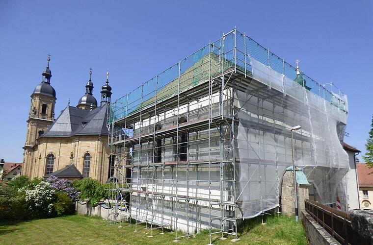 Die Arbeiten zur Sanierung der Klosterkirche in Gößweinstein haben mit dem Aufbau des Gerüstes begonnen. Als nächstes wird das Kirchendach abgedeckt, um die statischen Probleme des Dachstuhls zu beheben. Auch im Kirchenschiff wird dazu ein Innengerüst aufgebaut.