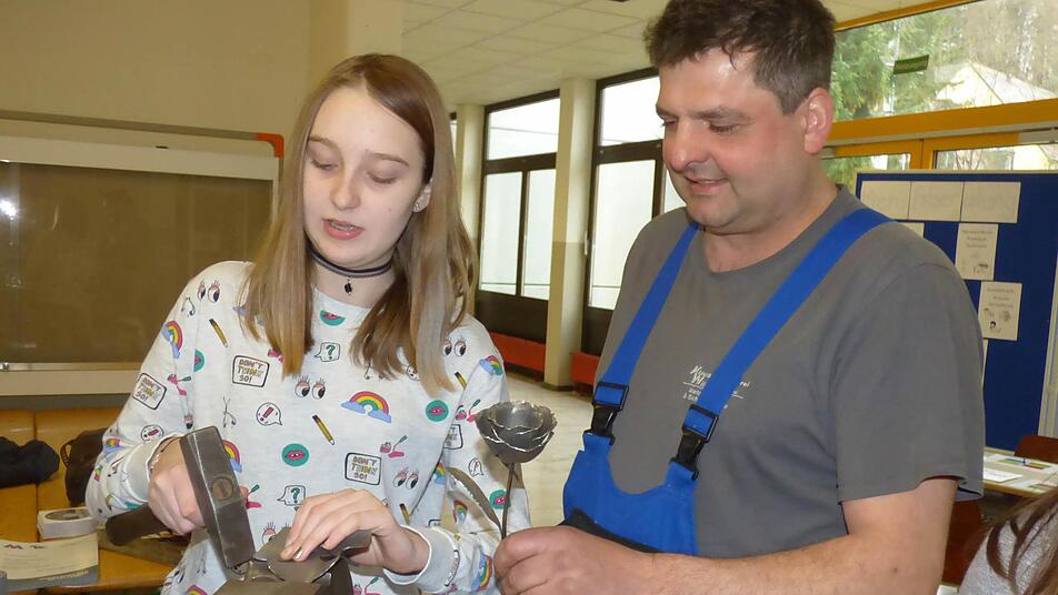 Auch Metallbaumeister Klaus Will aus Geschwand sucht händeringend nach einem Lehrling und findet keinen. Er würde auch ein Mädchen als Auszubildende einstellen und zeigt zwei Mädchen, wie eine Rose geschmiedet wird. Dies fängt bei der Planung am Laptop an und endet in der technischen Ausführung am Amboss mit dem Schmiedehammer. "Metallbauer", früher hieß dieser Beruf Schlosser, "ist ein schöner und vielseitiger Beruf mit dem man richtig gutes Geld verdienen kann", sagt Will.