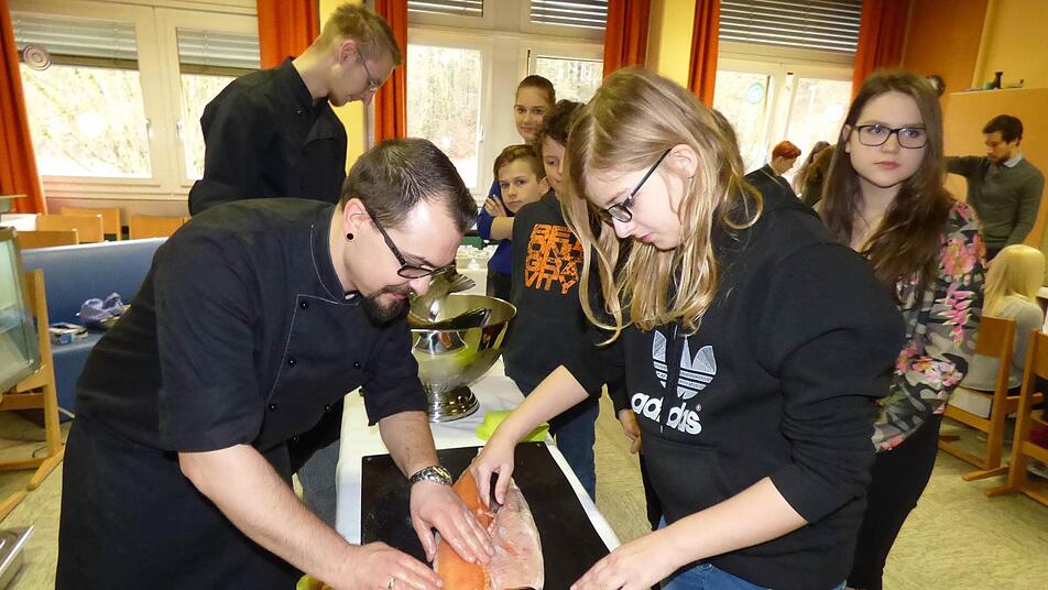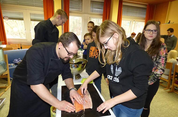 "Das macht sehr viel Spaß, zusehen ist interessant und selbst mitmachen spannend und lehrreich", sagt Sarah Feigl aus dem Pottensteiner Ortsteil Trägweis, die die Klasse M 7 besucht. Sie darf mit dem stellvertretendem Küchenchef des Gößweinsteiner Hotels Stempferhof einen Lachs filetieren. Michelle Zeitler, ebenfalls vom Stempferhof, ist im zweiten Lehrjahr zur Hotelfachfrau und zeigte Katharina Hengel aus Geusmanns von der 7 Klasse der Mittelschule Pottenstein, wie man einen Tisch richtig eindeckt. Für Michelle Zeitler ist es der Traumberuf. "Ich bin total gerne mit Menschen zusammen und als Hotelfachkraft immer in Bewegung", schwärmt sie und wirbt so gleichzeitig für Nachwuchs im Gastronomiegewerbe.