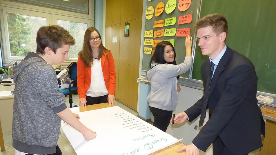 Der künftige Leiter der Volksbankfiliale Gößweinstein, Johannes Sebald, leitete den Workshop "Assessmentübungen". Solche Übungen werden bei Einstellungen immer beliebter. Dabei müssen die Bewerber um einen Ausbildungsplatz zusammen mit anderen in der Gruppe Aufgaben lösen. Nina Götz aus Sattelmannsburg, die Schulsprecherin der Mittelschule Gößweinstein, findet die Erklärungen von Banker Johannes Sebald "total klasse, weil wir viel dabei lernen."