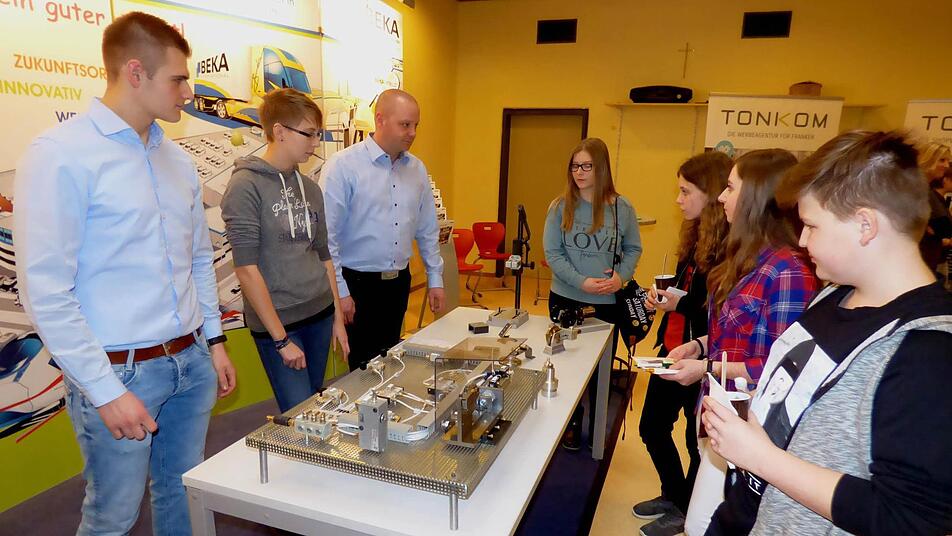Die Auszubildenden Florian Hartmann aus Trockau und Elisabeth Distler aus Obertrubach von der Pegnitzer Firma BEKA (Baier und Köppel) informierten mit ihrem Ausbilder Alexander Körner über die Berufe Industriemechaniker und Zerspanungsmechaniker. Florian Hartmann ist im dritten Lehrjahr zum Zerspanungsmechaniker und Elisabeth Distler im ersten Lehrjahr zur Industriemechanikerin. Mit über 650 Mitarbeitern ist die Firma BEKA ein wichtiger Arbeitgeber in Pegnitz und im Zweigwerk in Pottenstein und bildet jährlich etwa zehn Lehrlinge aus, die sie dann auch übernimmt.