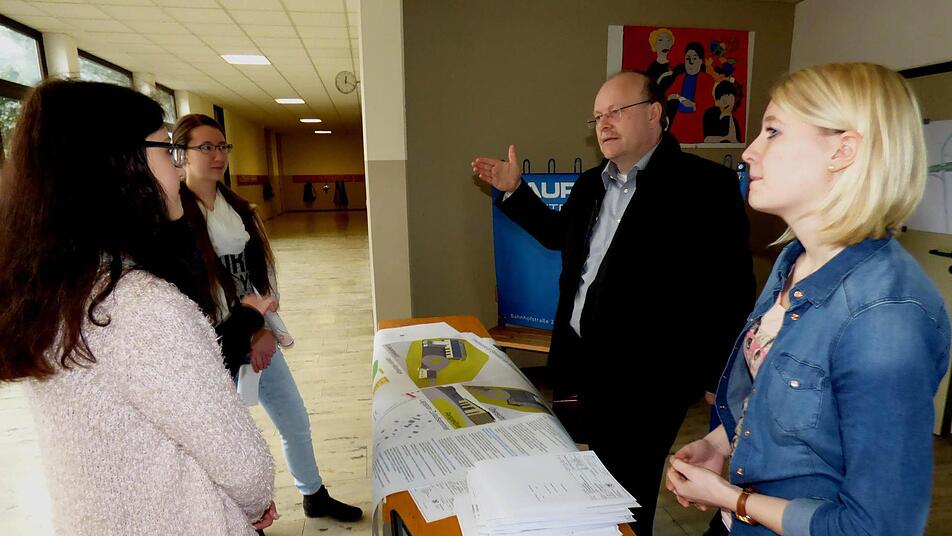 Weitere Workshops bietet die Sparkasse, Schmetterling Reisen, Aldi, Tonkom und die Arbeitnehmerbildungs- und Begegnungsstätte Obertrubach an. Am Stand des Pegnitzer Ingenieurbüros BaurConsult informieren sich die Schüler über das Berufsbild des Technischen Zeichners, das sich gravierend verändert hat. Gezeichnet wird heute nicht mehr am Reißbrett, sondern mit dem Computer. Und zwar dreidimensional, erfahren sie. Auch der Beruf einer Einzelhandelskauffrau kann spannend sein, wie man am Stand von Edeka sehen kann.