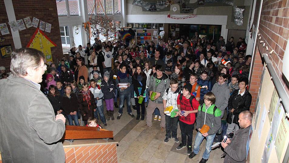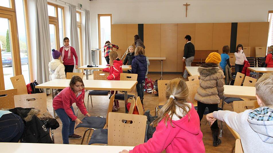 Die Lehrer machen sich anschließend mit ihren Klassen auf den Weg. Die Kinder der vierten Jahrgangsstufe sind im Pfarrzentrum untergebracht, sie haben fünf Minuten Fußweg von der Schule aus. Dritter Bürgermeister Alfred Dormann (WGH) begleitet den Tross, vor Ort verteilt Kirchenpfleger Otmar Schneider Schlüssel an die Lehrkräfte.