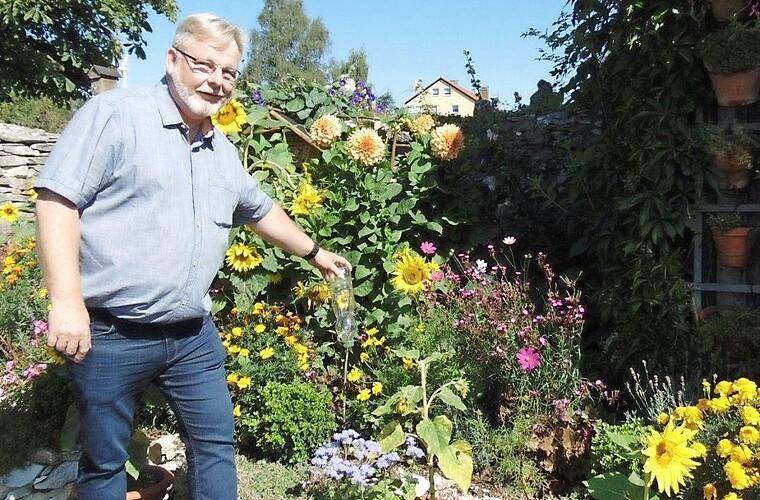 Im Garten fühlen sich die Bewohner des Hauses Martinsruh gerade so richtig wohl. Ihr Augenmerk gilt den Blumen. Ein anderer harkt die Erde in den Beeten, in denen er Salate und Gemüse angepflanzt hat. Die friedliche Stimmung im Garten spiegelt die idyllische Lage des Hauses am Ortseingang von
