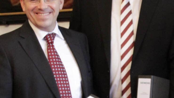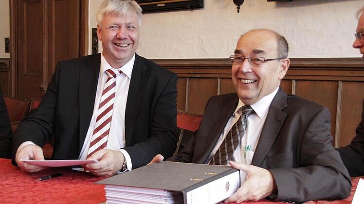 Sechs Aktenordner umfasst der Bauantrag der Siemens AG für das Büro- und Forschungsgebäude in der Siemensstraße 3. Für die Prüfung der detaillierten Unterlagen des sechsgeschossigen Baukörpers mit einer gesamten Geschossfläche von 45 000 Quadratmetern benötigten Bauamtsleiter Gerhard Zedler und seine Mitarbeiter nur zwei Monate. Am Mittwoch überreichten Zedler und Oberbürgermeister Franz Stumpf (CSU/WUO) im Rathaus dem Generalmanager des Forchheimer Vorhabens, Thorsten Kuhfeld, die genehmigten Pläne.
