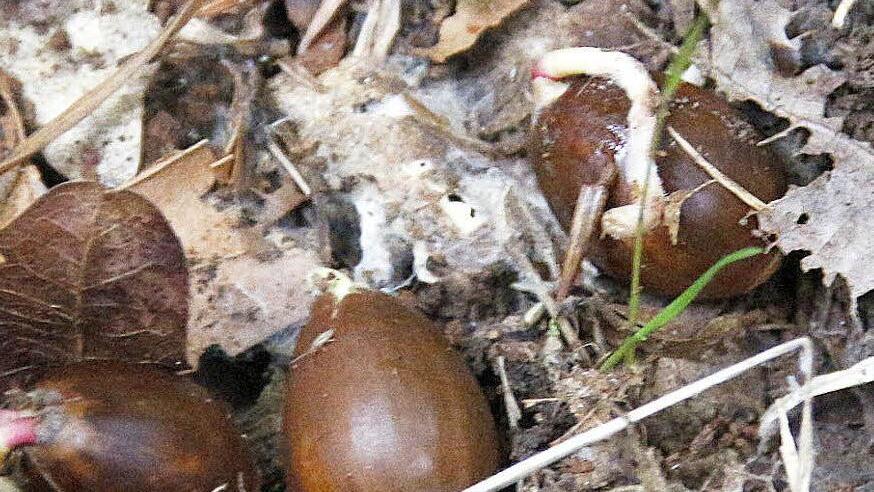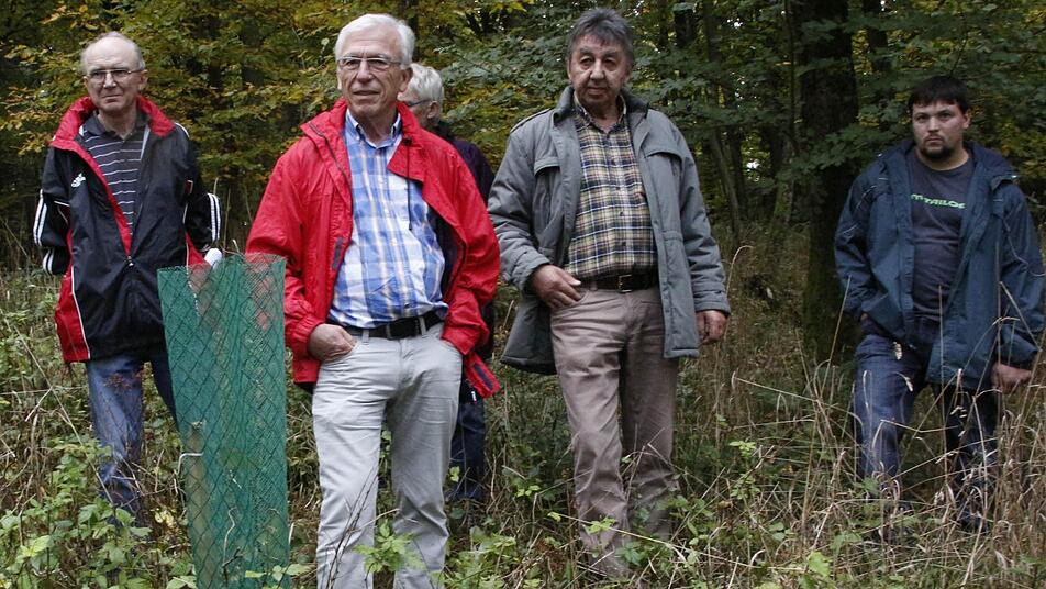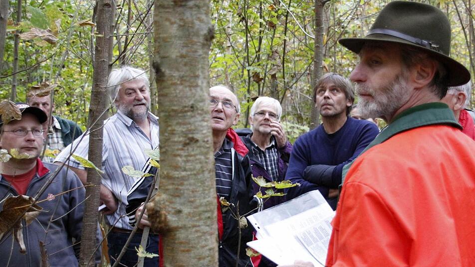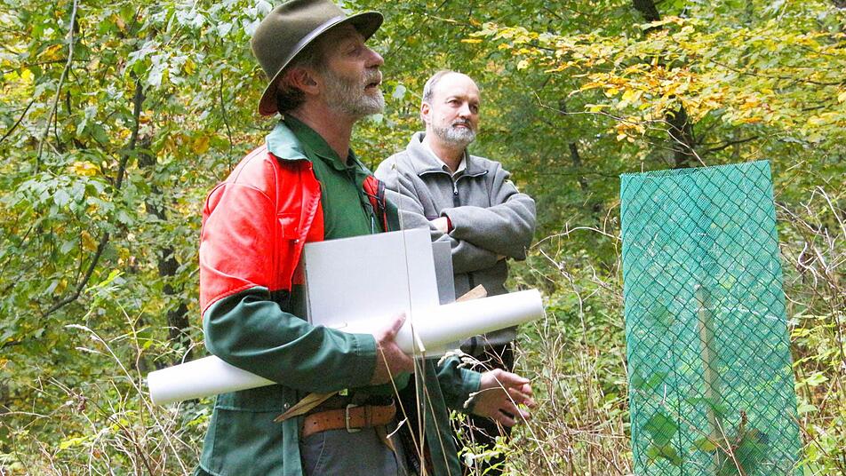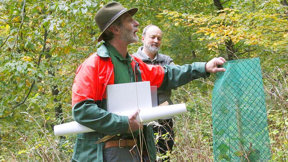 "Sie garantiert eine genetische Vielfalt, die ein gesunder Wald braucht", erklärt Bittermann. Sein Zauberwort für eine naturnahe Waldbewirtschaftung heißt Naturverjüngung. Zum Beweis kniet sich Bittermann nieder und zeigt die keimenden Eicheln, die auf dem Boden liegen. "Allerdings geht das nur bei einem guten Gerüst, wenn die Samen im Boden auch Wurzeln schlagen können", erklärt Bittermann. Diese natürliche Verjüngung soll unter dem Schirm des Altbestandes stattfinden, wobei weitgehend auf eine Einzäunung verzichtet werden soll. Wo stellenweise noch keine Naturverjüngung angekommen ist, sollen Einzelpflanzen wie Bergahorn, Vogelkirsche oder Walnuss geschützt in Wuchshüllen ergänzt werden. Diese Hilfen sind notwendig, um die Pflanzen vor dem Wildverbiss zu schützen.