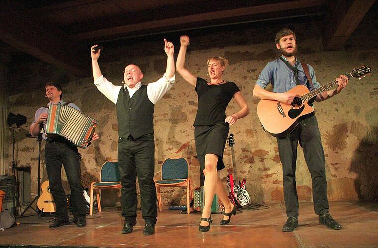 Mit Waschbrett, Maultrommel und Mundharmonika, Gitarre, Melodica, Glockenspiel und Ziehharmonika sorgten Bernhard Gruber und Neuling Berni Filser für den einschmeichelnden und gleichzeitig mitreißenden Bavaria-Sound. Diese Heimatromantik kombinieren der gebürtige Oberpfälzer Jürgen Hirner (Hemau) und die aus Mühldorf am Inn stammende Bianca Bachmann mit trefflichem schwarzem Humor, witzig, pfiffig und stets treffsicher.