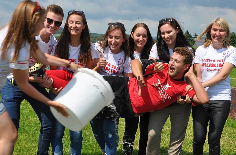 Unter einem Vorwand lockten sie den Coach, der zuvor in der Reservemannschaft seinen Mann stehen musste, an den Spielfeldrand zu einem Foto - dazu sollte er von ihnen auf Händen getragen werden. Der 31-Jährige war seinen Damen also ausgeliefert und musste hilflos einen Eimer Wasser über sich ergehen lassen, mit dem sich Cousine Lena Amon unbemerkt von hinten anschlich. Auch sonst scheint die Welt bei den Eggolsheimer Fußballerinnen im Lot zu sein, Spaß und Erfolg haben sie auf jeden Fall zur Genüge.
