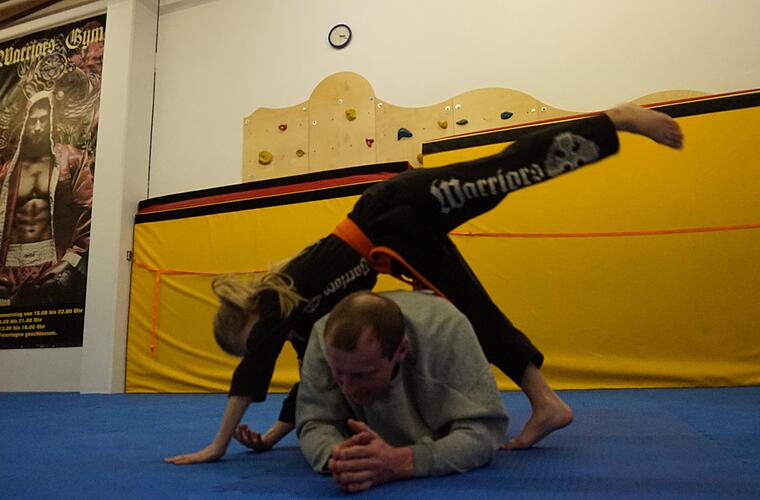 Auch zwei Erwachsene nutzten die Chance, im Bereich "Fallschule" dazuzulernen, so dass zehn Teilnehmer im Warriors-Gym versammelt waren. Nach einem kurzen knackigen Aufwärmen ging es mit Gleichgewichtsübungen weiter. Es wurden mit den Füßen Zahlen in die Luft geschrieben sowie die Standwaage, der Kopfstand, der Handstand und vieles andere geübt. Die Kinder sollen ein polysportives Grundgerüst erhalten, weshalb neben der Koordination die Balance nicht zu kurz kommt.