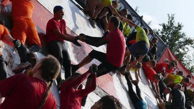 Schließlich brauchen beim Tough Mudder auch die Sportlichsten Hilfe. Nicht beim Entlanghangeln am "King of the Swingers". Auch bei der "Elektroschock-Therapie", bei der sie durch Fäden mit 10 000 Volt Spannung rennen müssen, geht es eher um die eigene Leidensfähigkeit, doch spätestens bei der "Pyramid Scheme" ist Gruppenarbeit in Form von Räuberleiter angesagt.