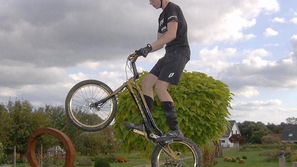Es ist nicht zu übersehen. "Glückwunsch - Tobias ist süddeutscher Meister" prangt auf einem großen Betttuch, das an einer Scheunenwand angebracht ist. Verantwortlich dafür sind Sandra und Julia Schmitt, die damit ihrem Bruder Tobias zu dessen Titel im Fahrrad-Trial gratulieren wollen. Sein erster Sieg ist es nicht. Bereits im Alter von fünf Jahren fuhr der inzwischen 15-Jährige über Hindernisse und nahm an seinem ersten Pokalwettbewerb teil. So holte er sich auch den Titel des norddeutschen Meisters und bei vielen anderen Wettkämpfen. Nicht nur einmal.