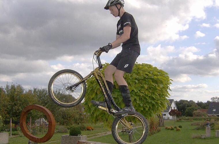 Auf der gesamten Länge der Garagenwand reiht sich deshalb Pokal an Pokal, darunter baumeln Medaillen in allen Formen. Während Mutter Andrea das kleine rote Trikot mit der farblich passenden Hose zeigt - seine erste Ausrüstung - düst der Sohn auf dem Rad über den Hof zu einer Wiese, springt aus dem Stand heraus über einen großen Baumstumpf, balanciert zwischen anderen Hindernissen herum, weiß exakt, wann er mit dem Rad stehen bleiben muss, ohne mit den Füßen die Wiese zu berühren, und springt mit dem Rad erneut aus dem Stand heraus auf eine Mauer. Dort dreht er auf minimalem Platz das Rad herum und fährt die Mauer entlang. Das Rad und er - sie scheinen zusammen zu gehören.