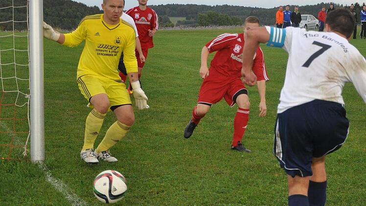 Vielleicht war der plötzliche Rücktritt von Coach Holger Feinermann, der nach dem Training am Donnerstag das Handtuch warf, dann doch eine zu große Bürde. So mussten letztlich zwei Standardsituationen herhalten. Ein an Grüner verursachter Freistoß brachte die Gastgeber zunächst mit 1:0 in Front (19.). Johannes Eckert hob die Flanke vor den Kasten von TSC-Keeper Frank Braungart, der wie angewurzelt auf der Linie stehen blieb. Jürgen Probst köpfte die Pille aus nächster Nähe in die Maschen. Wer jetzt dachte, die Führung brächte Ruhe und Sicherheit ins Spiel der SG, der täuschte sich. Nur drei Minuten später glich Bärnfels durch Martin Müller, ebenfalls per Freistoß, aus.
