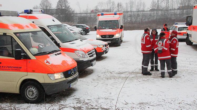 Unterdessen machten sich die Sprengstoff-Experten daran, den "explosiven Fund" zu untersuchen, während auf dem Pendlerparkplatz ein Einsatzkommando aus Helfern des Roten Kreuzes gebildet wurde, die ebenfalls mit einem halben Dutzend Einsatzfahrzeugen inklusive Notarzt vor Ort waren. Die Kommunikation zwischen dem Einsatzleiter und den Sprengstoffexperten gestaltete sich offensichtlich schwierig. Denn auf Nachfrage, was denn Stand der Dinge sei, zuckte er immer wieder nur mit den Achseln und verwies auf Polizeisprecherin Anne Höfer, die bei Schneetreiben aus Bayreuth angereist kam, obwohl sich mittlerweile herumgesprochen hatte, dass es gar keine Bombe gab.