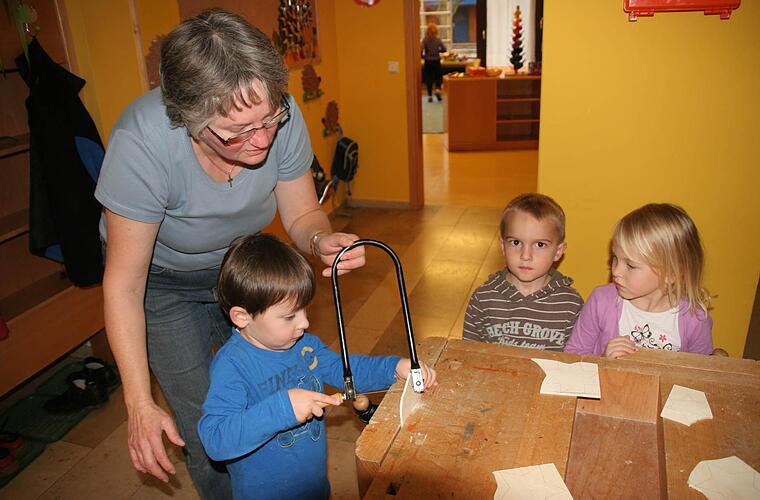 Begeistert ist auch die fünfjährige Laila von dem Vorschlag: Sie zieht am liebsten mit ihrer Erzieherin Cordula Hofmann die schönen kleinen Perlen, Glassteinchen und Glitzersternchen auf die Kunststofffäden auf, die dann wiederum über die vorher ausgesägten Pressspansterne gezogen werden.