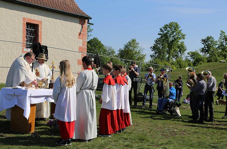 Sie alle machten unterwegs viermal Halt, um für alle Berufe wie Landwirte, Förster und Handwerker, für Lehrer und Seelsorger oder auch Politiker, Ärzte und Polizei zu beten. Bei einer angenehmen Brise und herrlichem Wetter erwarteten die Pfarrer Michael Gehret aus Pinzberg und Alfred Beiße aus , Leutenbach dieWallfahrer, um vor der Walburgis-Kapelle den gemeinsamen Gottesdienst zu zelebrieren.