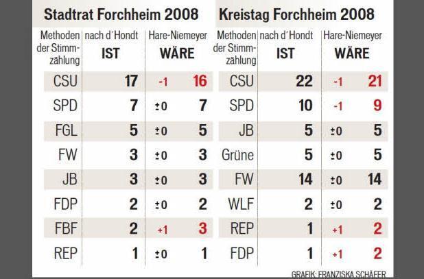 CSU und SPD verlieren, FDP und Republikaner gewinnen  Auch der Kreistag würde sich anders zusammen setzen: "CSU und SPD hätten, wäre 2008 schon nach Hare-Niemeyer ausgewertet worden, je einen Sitz weniger", sagt Frithjof Dier, Kreiswahlleiter am Landratsamt. Dafür dürften sich FDP und Republikaner freuen: Ihnen stünde jeweils ein zweiter Sitz zu.