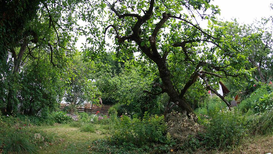 In Hörlins Garten finden sich jede Menge Obstbäume - und zwar in jedem Lebensstadium. "Einige Bäume sind überaltert, die meisten Gartenbesitzer hätten die wahrscheinlich längst abgesägt, weil sie nicht mehr schön sind", erklärt Hörlin. "Aber ich lasse sie in Würde sterben. Das Totholz ist wichtig für viele Vögel und Insekten." Dafür nutzen nun etwa Rosen die abgestorbenen Bäume als Kletterhilfe - ein sehr interessanter und schöner Anblick.
