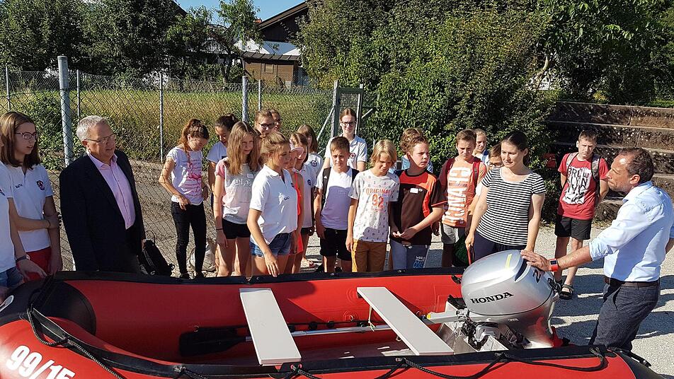 Bei den Vertretern der Wasserwacht ließen sich die Schüler das Boot erklären, das in Ebermannstadt stationiert ist. In Forchheim gibt es vier weitere. Es gibt psychologisch ausgebildete Mitarbeiter, die nach Einsätzen für Gespräche bereitstehen. Philipp Nützel informierte, dass man mit 15 die Ausbildung zum Taucher beginnen könne. In den Einsatz dürfe man aber erst mit 18 Jahren. Zuvor müssen 30 Tauchgänge im Freien und 130 Unterrichtseinheiten durchlaufen werden. Geübt wird auch im Freibad in Ebermannstadt; ebenso das Tauchen im Winter unter Eis. "Das sind dann immer drei Leute. Wobei einer taucht, einer das Seil hält und ein Zusatztaucher dabei ist. Denn unter einer zehn Zentimeter dicken Eisschicht kann man keine Löcher mehr von unten machen", erklärte Nützel.