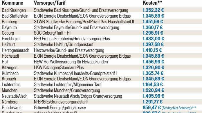 Dabei besteht für Gasverbraucher in Franken eine weitere einfache Möglichkeit, Kosten einzusparen: Mittlerweile sind neben dem örtlichen Grundversorger im Schnitt 100 weitere Gasversorger verfügbar, in Bamberg beispielsweise sind es sogar weit über 200. Ein Wechsel zu einem alternativen Gasanbieter birgt ein hohes Einspar-Potenzial. Ein exemplarischer Gaspreis-Vergleich in Bamberg mit einem jährlichen Gasverbrauch von 18 000 Kilowattstunden zeigt Einspar-Möglichkeiten von fast 600 Euro bei einem Wechsel aus der Grundversorgung bei den Stadtwerken (mit rund 16500 Kunden) in einen verbraucherfreundlichen Gas-Tarif (siehe auch Tabelle).