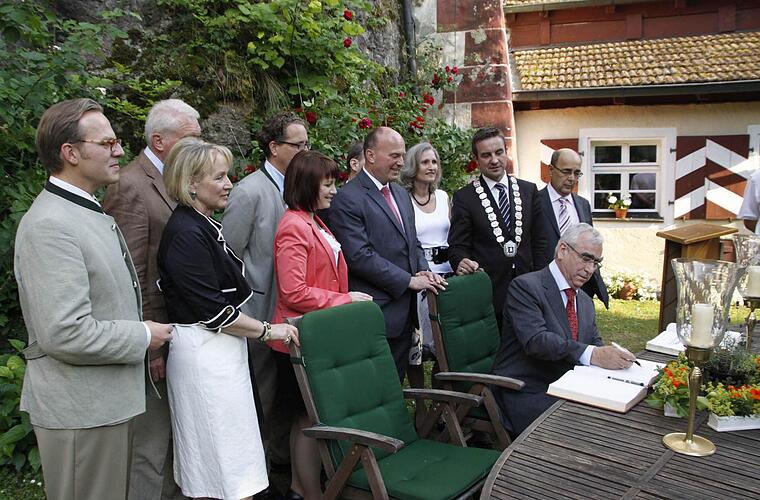 Nachdem er sich ins Gästebuch der Marktgemeinde eingetragen hatte, skizzierte Waigel im Rahmen der Veranstaltungsreihe "Politischer Sommer 2013" in der Turnhalle ″ Überlegungen zur Rolle Deutschlands bei der europäischen Währungs- und Finanzpolitik. Waigel sprach als einer, der damals die Einführung des Euros leidenschaftlich und mit großer innerer Überzeugung vorangetrieben hatte.