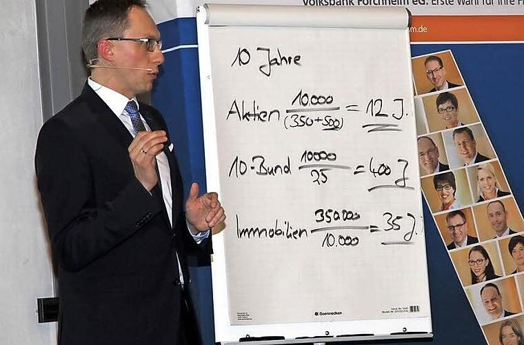 Auch bei der Volksbank haben viele der Kunden ihr Geld kurzfristig und nahezu zinslos angelegt. Doch das mühsam Ersparte wird durch fehlende Zinseinnahmen und der Inflation im Laufe der Jahre regelrecht aufgefressen. "Ihre 10 000 Euro, die heute auf dem Kontoauszug stehen, werden auch in zehn Jahren noch dort stehen. Nur was bekommen Sie dafür dann noch?", fragte Joachim Hausner in die Besucherrunde hinein.