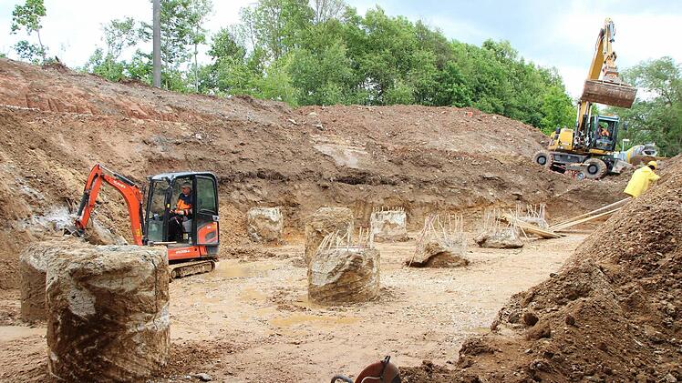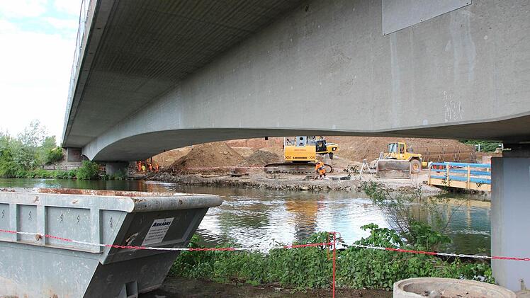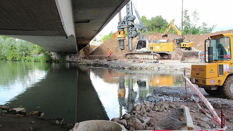 Bis zum Triathlon fertig Der erste Abbruch fand in den Tagen nach Ostern statt. Heute ist keine Spur von der Brückenhälfte zu sehen - ausschließlich alte Überreste der Betonpfähle ragen noch versteckt aus dem Flussbett, das vorläufig für die Bauarbeiten aufgeschüttet wurde. Wer in diesen Tagen über die A73 fährt, kann von oben das Arbeitsgerät sehen. Ein Bohrer, 26 Meter hoch, 130 Tonnen schwer, ragt in die Lüfte. 14 Meter tiefe Löcher werden mit diesem Gefährt aus dem Boden gehoben. Einen Erdhügel dahinter findet man bereits die Sockel für die neue Brücke. Einige Tage im Zeitverzug sind sie auf der Baustelle, "ansonsten läuft alles wie geplant": Bis Ende Juni müssen die Bauarbeiten auf der Flussseite beendet sein, dann soll hier ein Triathlon stattfinden.