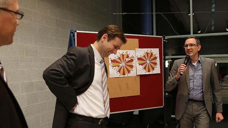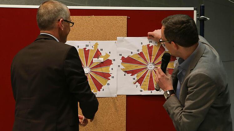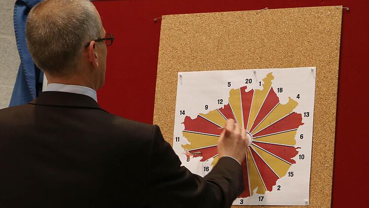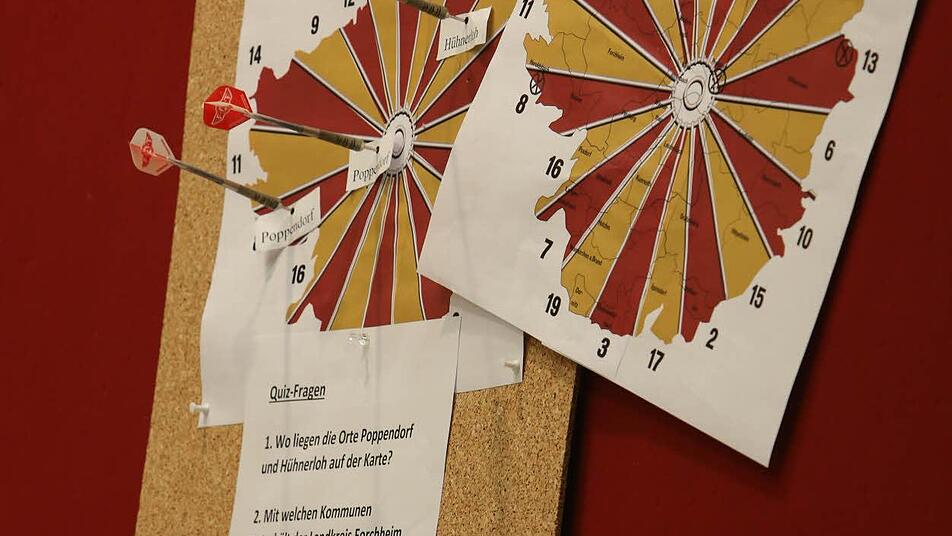 Dartspiel auf den Umriss des Landkreises wurden Klaus Schulenburg und Hermann Ulm mit fünf Wissensfragen zum Landkreis Forchheim bei der Diskussion zur Landratswahl getestet. Beide erreichten hier zwei Punkte. Hätten Sie mehr gewusst? Hier die Fragen: