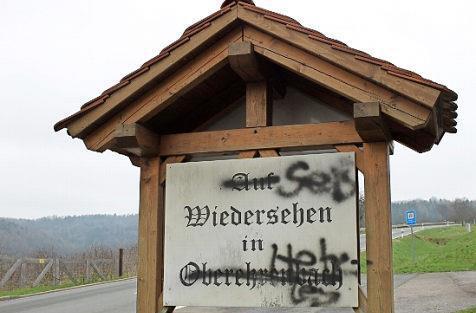 Das Grußschild am Ortsende ist mit schwarzer Farbe verunstaltet worden, die ohne Beschädigung kaum zu entfernen ist.