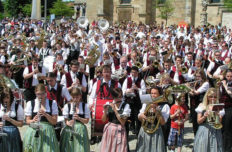 Ein grandioses Bild bot sich den Besuchern dann, als sich 500 Bläser und Trommler vor der Kulisse der St.-Anna-Kirche zu einem Gemeinschaftschor vereinten. Eine beeindruckende Masse mit vollem Klang, die dafür sorgte, dass das Musikfest zu einer Demonstration für die Blasmusik wurde.