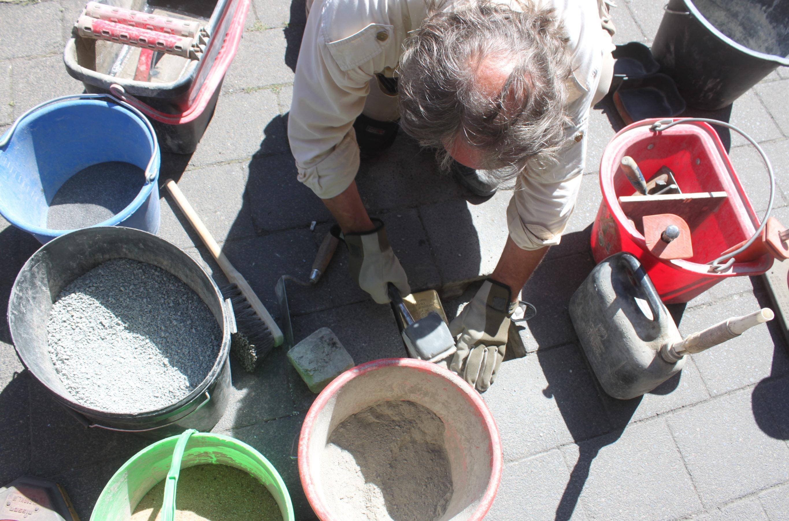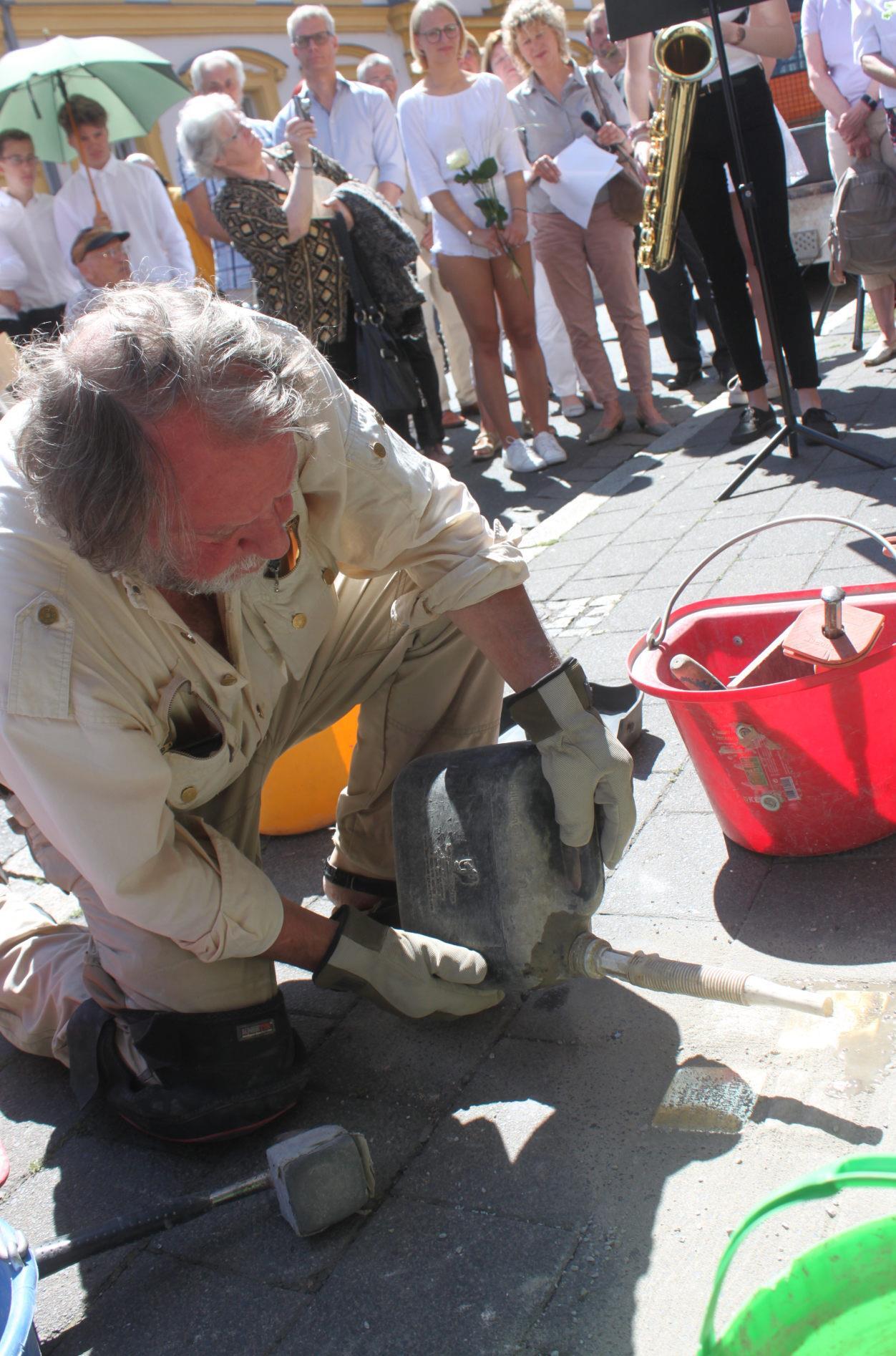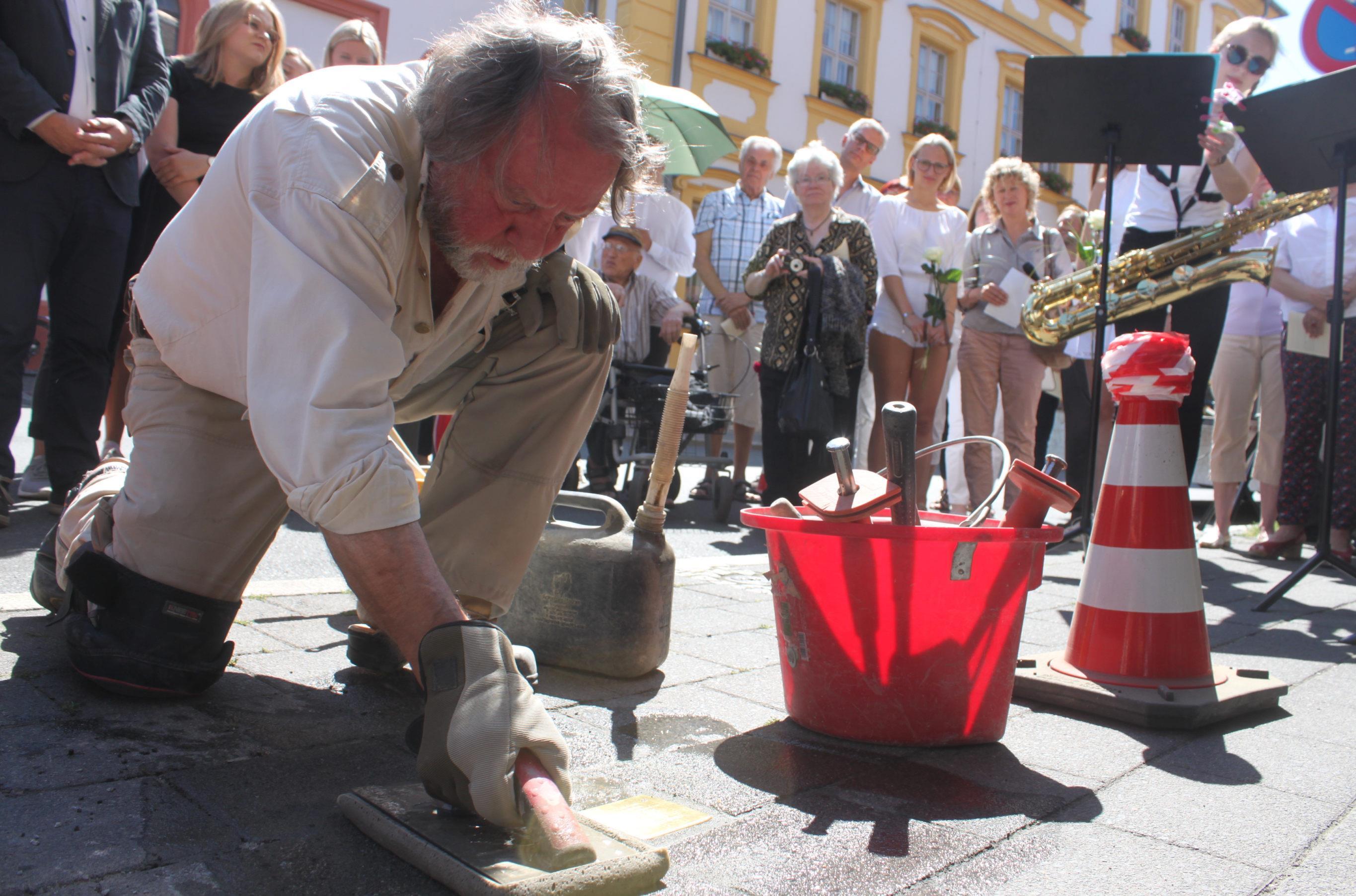 Behutsam setzt der Künstler Gunter Demnig den im hellen Sonnenlicht glänzenden Gedenkstein in die Lücke im Gehweg in der Nürnberger Straße 2. Die goldenen Stolpersteine erinnern an einen grausamen Teil der Stadtgeschichte.