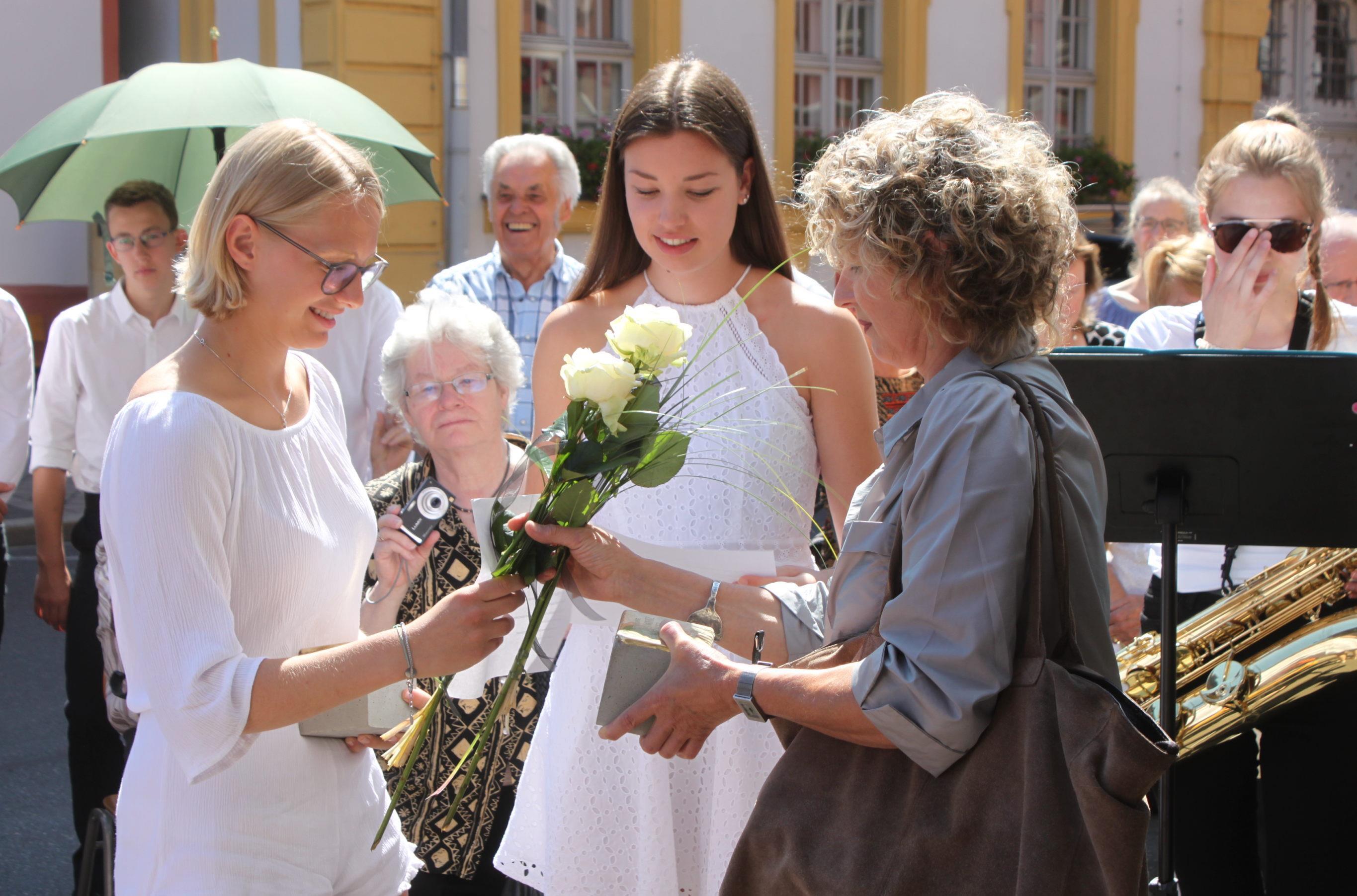 Am Donnerstag kamen vier neue hinzu. Neben den Stolpersteinen in der Nürnberger Straße erinnern in der Hornschuchallee 4 zwei Steine an die Forchheimerinnen Sofie Kotz (geboren 1860) und Rosa Tiesler (1875). Die vielen Besucher und Schüler lauschen andächtig den Lebensgeschichten der Forchheimer Juden. Das Orchester des Herdergymnasiums spielt ein jüdisches Klezmer-Stück. Pfarrer Martin Emge spricht segnende Worte.