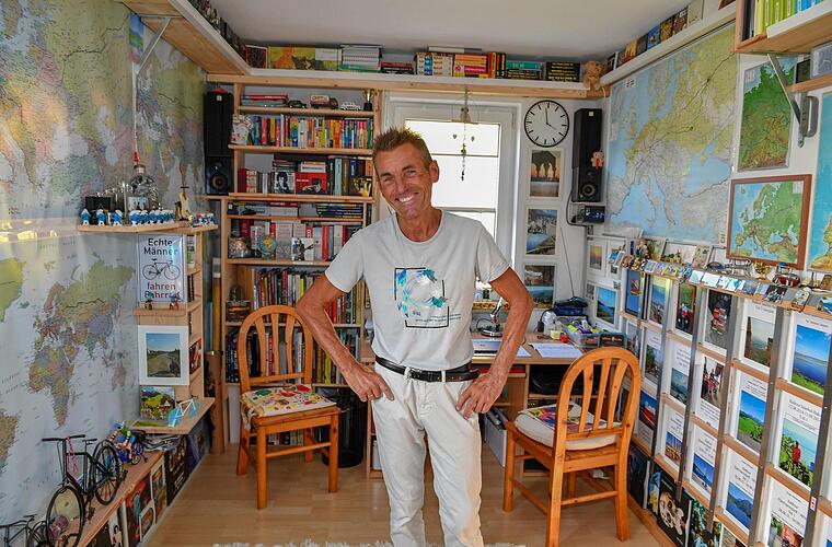 Teetrinken mit iranischen Lkw-Fahrern oder am Ufer des Baikalsees Pause machen. "Wegen solcher Momente fahre ich Rad", erzählt Jürgen Pöhlmann. Der 59-jährige "Ur-Ebser", wie er sich selbst nennt, steht im Arbeitszimmer seines Hauses. Die Wände sind behängt mit Weltkarten und Fotobüchern seiner Radtouren. In den letzten zehn Jahren ist er 18 Mal von Ebermannstadt aus in ferne Länder geradelt. Einmal die Welt im Längengrad zu umrunden ist sein Ziel.