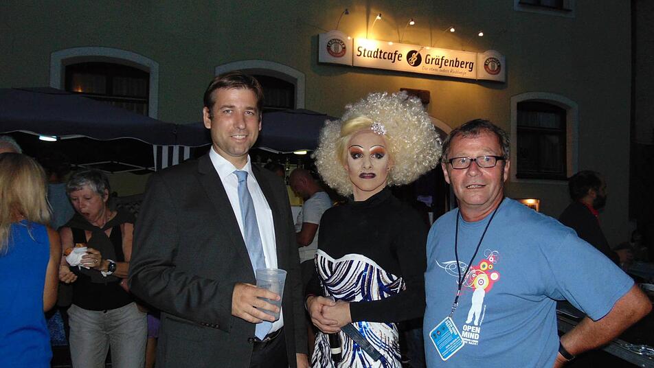 "Nun haben wir einen Schirmherrn, der vor Ort ist", erklären die Leute vom Team und stellen dem Landrat mit Monique da Costa eine bekannte Blondine zur Seite. Da Costa, die den Transvestiten Mary mimt, nutzt die Gelegenheit für ein Drei-Fragen-Interview. Ob der Landrat eine Notwendigkeit für diese Festival sieht, will da Costa wissen. "Dringendst, als Zeichen und Impuls in einer Zeit, wo man nicht weiß, wo die Leute stehen. Wo es Ängste und Vorbehalte gegen Politiker gibt", betont Landrat Ulm.