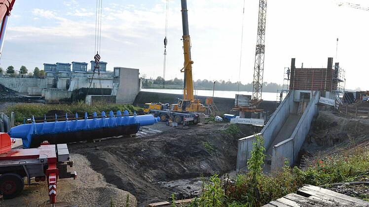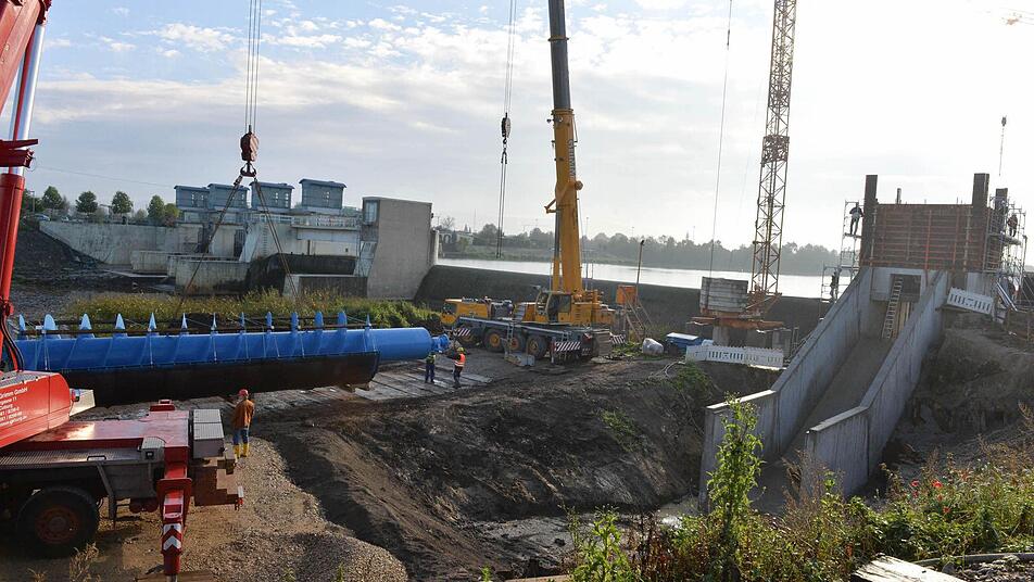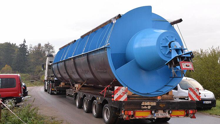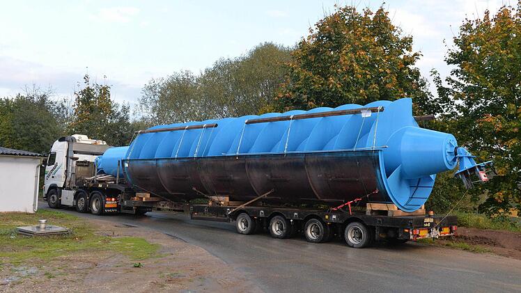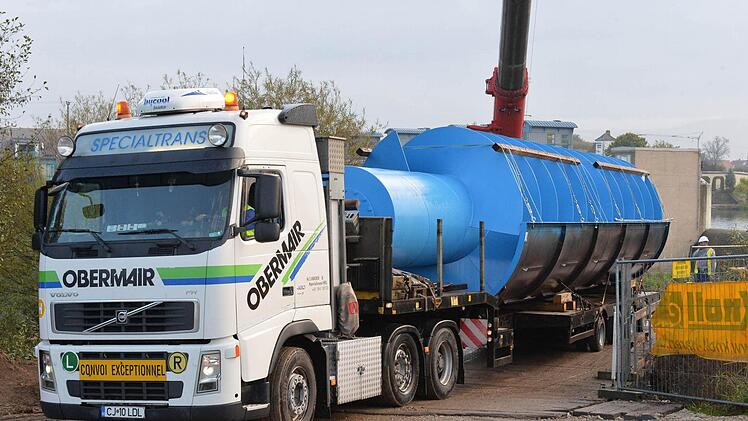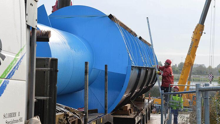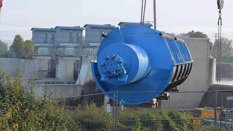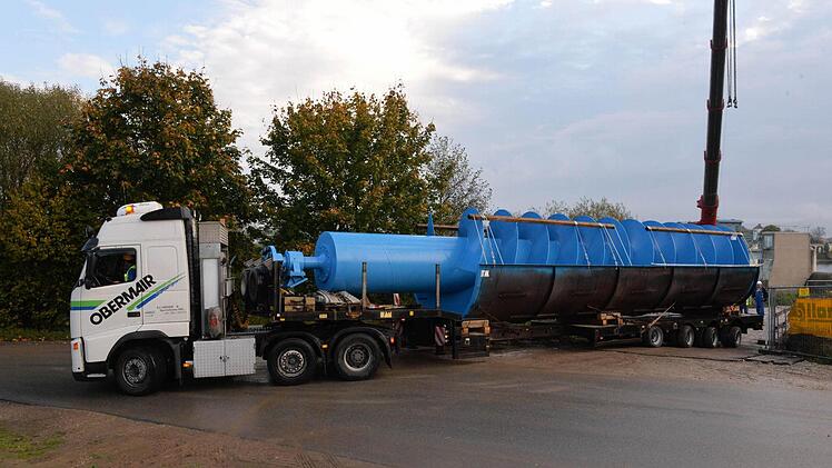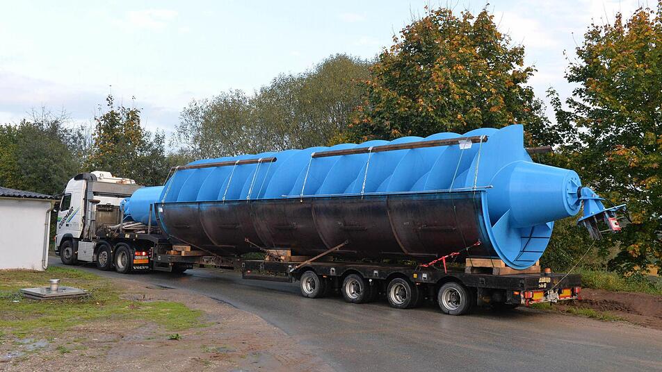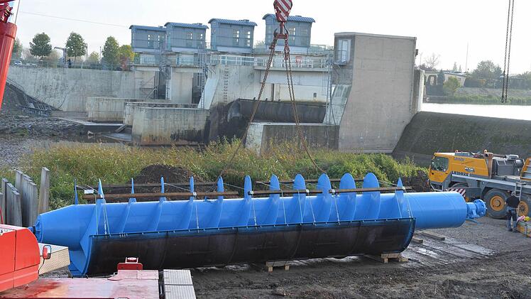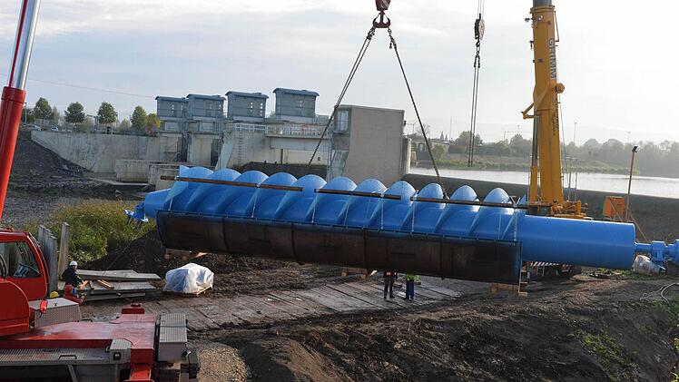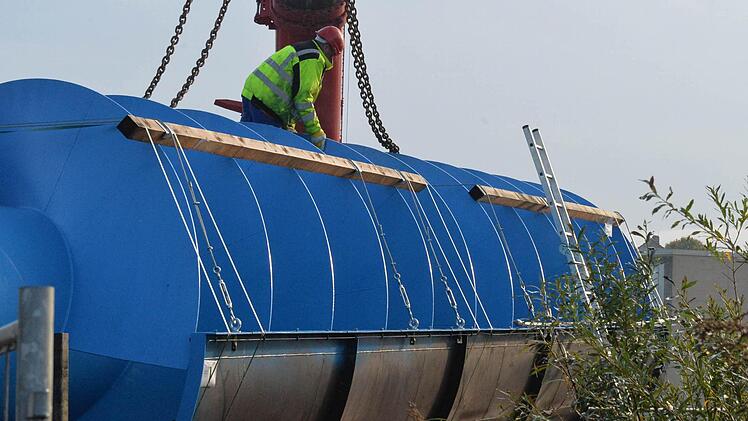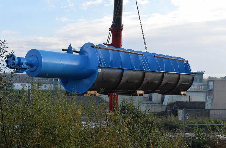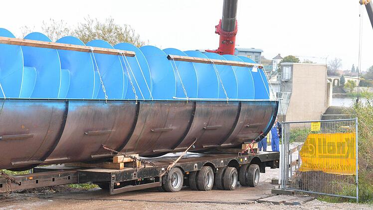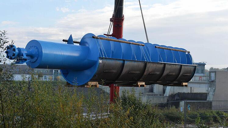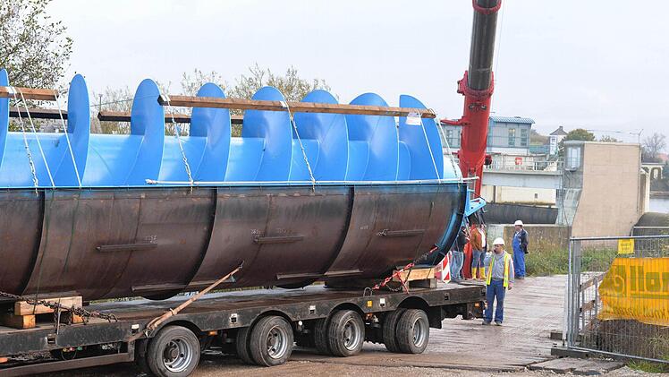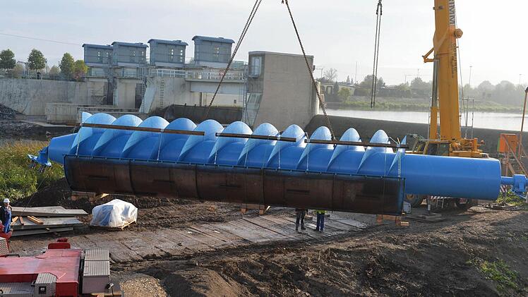 Das neue Restwasserkraftwerk am Main-Donau-Kanal bei Neuses an der Regnitz hat sein Herzstück bekommen: eine übergroße, 20 Tonnen schwere Wasserkraftschnecke.