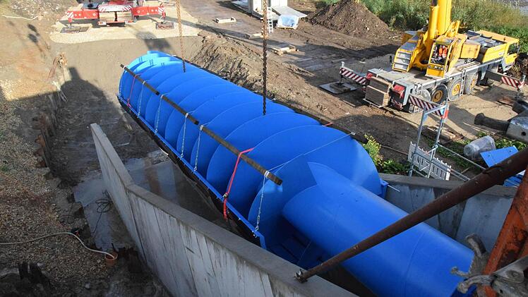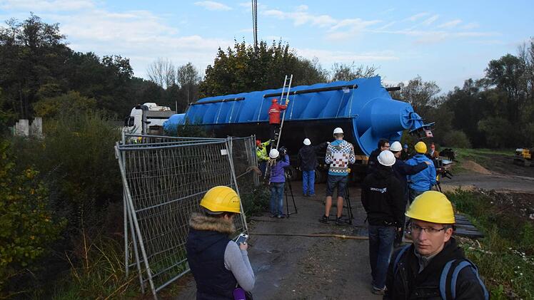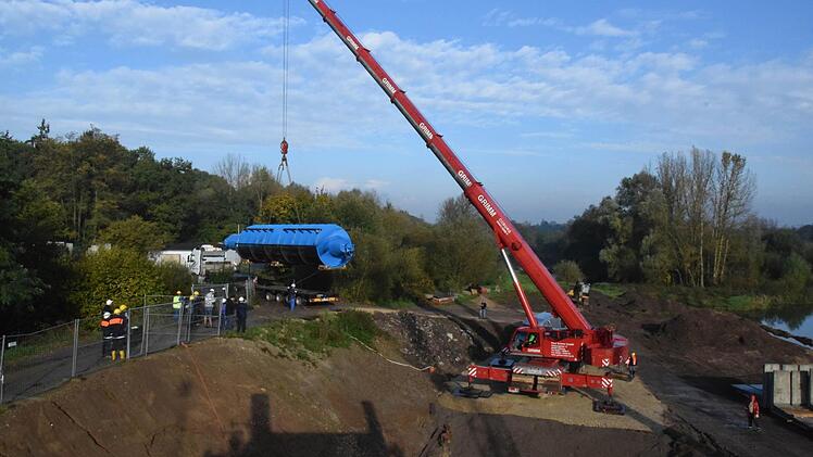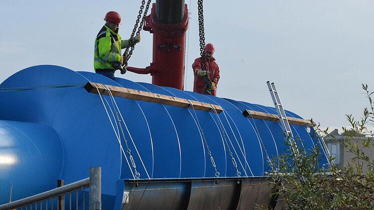 Technik und Umweltschutz passen wohl doch zusammen: In Neuses zumindest wurde jetzt eine 20 Tonnen schwere Wasserkraftschnecke in den Rhein-Main-Donau-Kanal gesetzt. Das riesige blaue Bauteil mit 18 Metern Länge ist das Herzstück eines Restwasserkraftwerks, das ab Dezember in den Probebetrieb gehen soll.