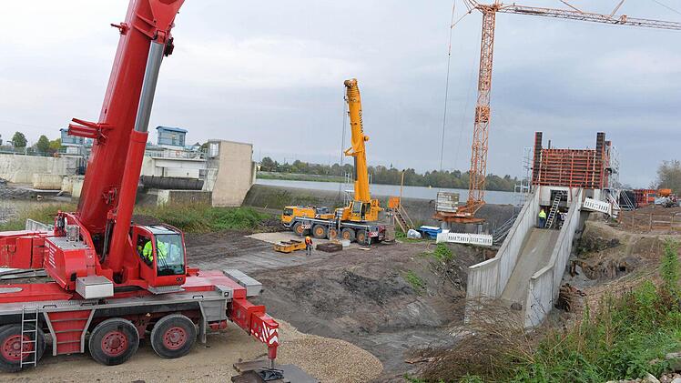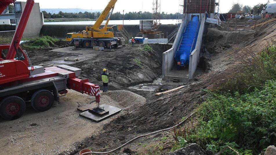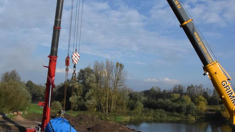 fischfreundliche Wasserschnecke zu installieren. Zwei Tage war sie auf einem Tieflader von Ungarn bis nach Oberfranken unterwegs. Am Mittwochmorgen dann hievten zwei Kräne die Stahlschnecke in die schräge Verankerungsposition des Kraftwerks an der Wehranlage Neuses, mit dem Restwasserabgaben in die Regnitz genutzt werden.