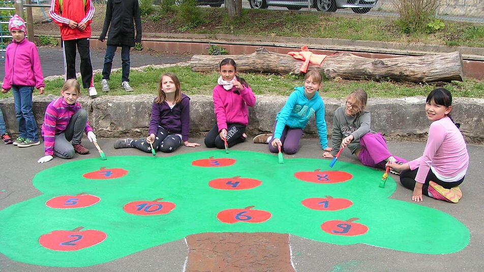 Mit einem bunten Clown, einem Apfelzahlenbaum und einem farbenfrohen Wörterhüpfer haben Schulkinder den Pausenhof ihrer Volksschule Weilersbach verschönert. Die Aktion hat allerdings auch einen pädagogischen Hintergrund.