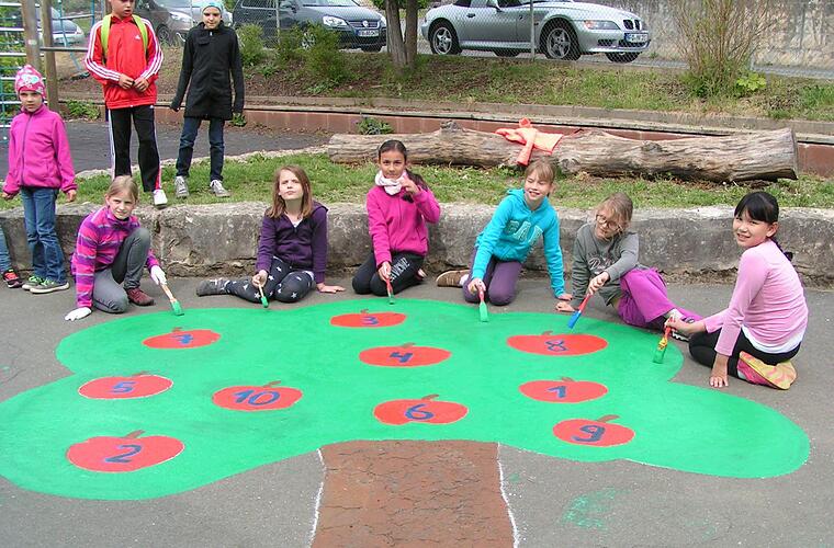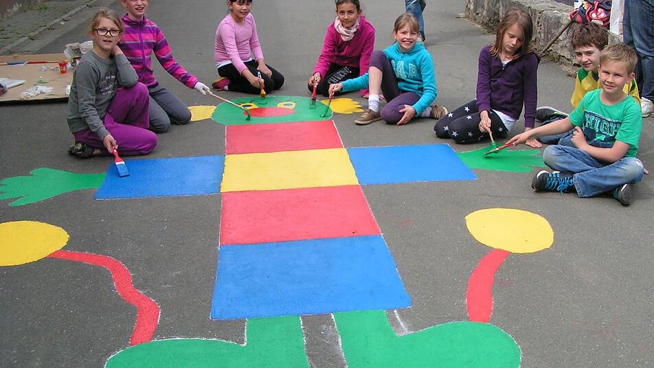 In alten Klamotten, mit Farbdosen und Pinseln machten sich die Mädchen und Buben der 3. und 4. Klasse daran, Leben und Farbe auf ihren Pausenhof zu zaubern. Allerdings auch mit einem pädagogischen Hintergrund: Angeregt wurde die Malaktion vom Elternbeirat, der den Kindern behilflich war. Begeistert darüber zeigten sich Schulleiterin Andrea Kohl und Lehrerin Regina Bappert.