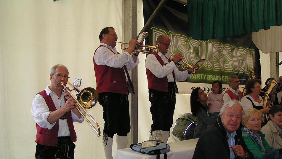 Die ersten Festgäste waren bereits zur Aufstellung am Bahnhof eingetroffen und mussten flugs unter Schirme und Dächer flüchten. Dann die Nachricht: Wegen des schlechten Wetters fällt der Festzug - eigentlich der Höhepunkt der Feier - aus. Die Festlichkeiten werden ins Zelt verlegt. Doch die gute Laune ließen sich die Musikanten und die vielen Gäste nicht verderben.