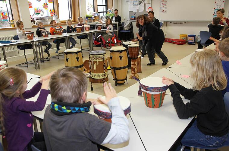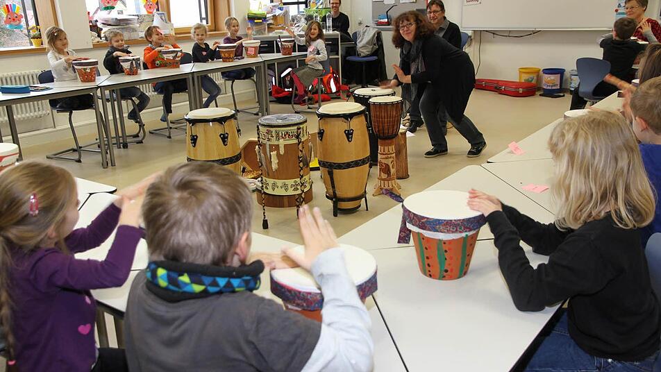 Die Eggolsheimer Klasse 1a bekommt eine besondere Schulstunde. Trommeln ist der optimale Einstieg, um ein Rhythmusgefühl zu entwickeln.