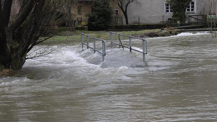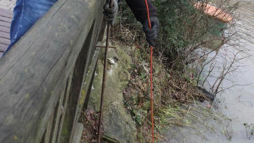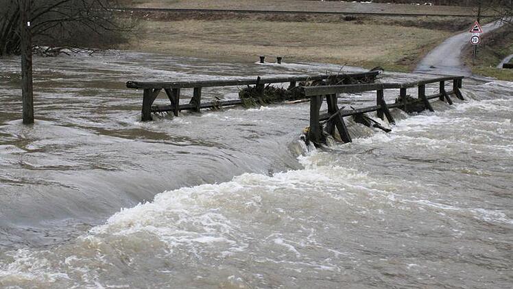Auf dem Steg dazwischen ließen Bernhard Görl und Georg Linz vom Wasserwirtschaftsamt Kronach ein Messgerät zu Wasser mit dessen Hilfe die Behördenvertreter den Abfluss der Wassermassen bestimmten. Das sei wichtig für Prognosen.